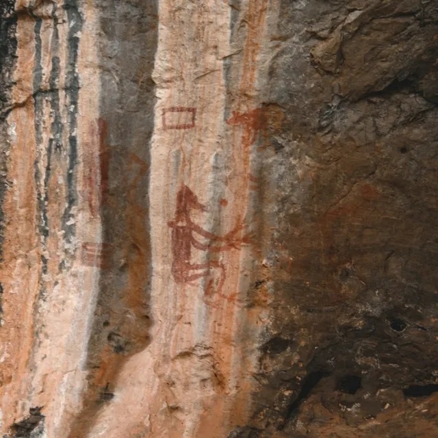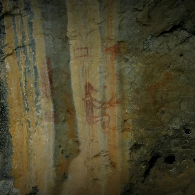 หลักฐานทางโบราณคดีที่ค้นพบเป็นภาพเขียนสีที่พบอยู่ตำแหน่งเดียว เขียนด้วยสีแดงทั้งหมด ลักษณะเป็นโครงร่างระบายสีทึบเป็นภาพประเภทต่างๆ ทั้งรูปลักษณ์ที่เป็นคนและสัตว์ และรูปลักษณ์ไม่เป็นคนและสัตว์ ทั้งหมด 6 ภาพ ดังนี้