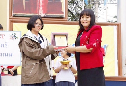 ดร.จิตราภรณ์ ใยศิลป์ ผู้อำนวยการโรงเรียนเฉลิมขวัญสตรี เป็นประธานในการมอบโล่แสดงความยินดีกับนางสาวบาริฏา จำลองราษฎร์และนางสาวธณพร วิรมย์เจียม นักเรียนชั้นมัธยมศึกษาปีที่่ 3.6 ที่สอบได้คะแนนนเต็ม 100 คะแนนวิชาคณิตศาสตร์ จากผลการทดสอบทางการศึกษาระดับชาติขั้นพื้นฐาน (O-NET) และแสดงความยินดีกับนักเรียนที่มีคะแนน O-NET สูงสุดในแต่ละวิชา ณ สนามหน้าเสาธงโรงเรียนเฉลิมขวัญสตรี เมื่อวันที่่ 31 มีนาคม 2559 พวกเราชาวเฉลิมขวัญสตรี ขอแสดงความยินดีมา ณ โอกาสนี้ (ภาพ:ข่าว/ประชาสัมพันธ์)