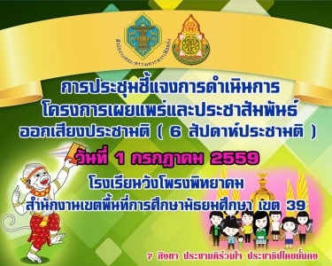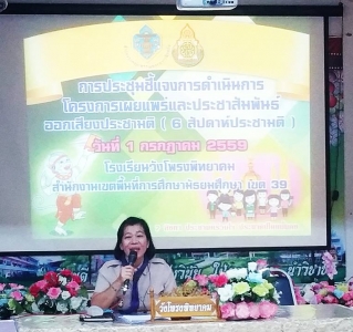 วันที่ 1 กรกฎาคม 2559 โรงเรียนวังโพรงพิทยาคม สพม.39 นางจันทร์แรม ขุนทอง รองผู้อำนวยการโรงเรียนเป็นประธานการประชุมชี้แจงการดำเนินการโครงการเผยแพร่และประชาสัมพันธ์ออกเสียงประชามติ ( 6 สัปดาห์ประชามติ) โดยมีข้าราชการครูและบุคลากรทางการศึกษาเข้าร่วมประชุมทั้งนี้เพื่อให้ข้าราชการครูและบุคลากรทางการศึกษาได้รับทราบและสามารถนำไปปฏิบัติให้เป็นแนวทางเดียวกันเกี่ยวกับการออกเสียงประชามติร่างรัฐธรรมนูญ เป็นการส่งเสริมความรู้เรื่องประชาธิปไตยในโรงเรียนซึ่งครูต้องนำมาสอนให้นักเรียนเข้าใจอย่างถูกต้องโดยเน้นย้ำการสอนให้เด็กคิดวิเคราะห์แยกแยะจากข้อมูลที่เป็นความจริงให้เด็กเห็นความสำคัญของการไปใช้สิทธิ์ลงประชามติ และเชิญชวนผู้ปกครองออกมาใช้สิทธิ์ลงประชามติอีกด้วย