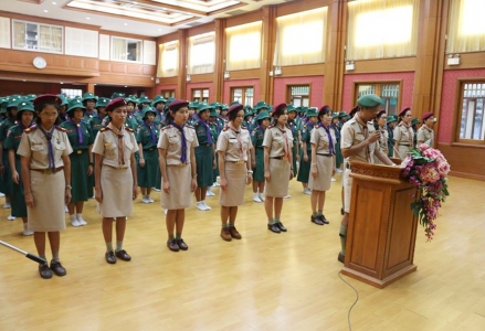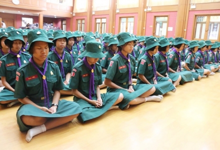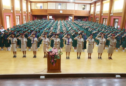 ว่าที่ ร.ต.บุญสืบ มะอิ รองผู้อำนวยการโรงเรียนเฉลิมขวัญสตรี ผู้อำนวยการกองเนตรนารีโรงเรียนเฉลิมขวัญสตรี นำคณะผู้กำกับและสมาชิกเนตรนารี ประกอบพิธีถวายราชสดุดี เพื่อเป็นการน้อมรำลึกถึงพระมหากรุณาธิคุณของพระบาทสมเด็จพระปรเมนทรมหาวชิราวุธพระมงกุฎเกล้าเจ้าอยู่หัว รัชกาลที่ 6 พระผู้ทรงพระราชทานกำเนิดลูกเสือไทย ณ หอประชุมราชานุเคราะห์ 3 โรงเรียนเฉลิมขวัญสตรี (ภาพ:อดิเรก/ข่าว:ประชาสัมพันธ์)
