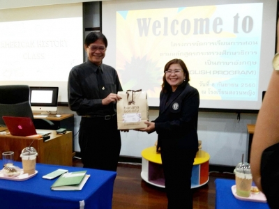 ดร.ผกามาศ บุญเผือก ผู้ช่วยผู้อำนวยการกลุ่มงานวิชาการ พร้อมด้วยครูกอบแก้ว ยลพันธุ์ หัวหน้าโครงการห้องเรียนพิเศษ Intensive English Program(IEP) โรงเรียนเฉลิมขวัญสตรี และคณะครูศึกษาดูงานการจัดกิจกรรมการเรียนการสอน หลักสูตรห้องเรียนพิเศษทางภาษา ณ โรงเรียนสงวนหญิง อำเภอเมือง จังหวัดสุพรรณบุรี เมื่อวันที่่ 7 กันยายน 2560 (ภาพ:กอบแก้ว/ข่าว:ประชาสัมพันธ์)