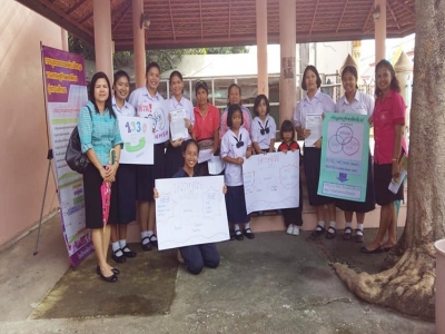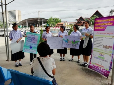 นักเรียนแกนนำและคณะครู ศูนย์ครอบครัวพอเพียง โรงเรียนเฉลิมขวัญสตรี ลงพื้นที่ชุมชนให้ความรู้เกี่ยวกับหลักปรัชญาของเศรษฐกิจพอเพียงและสิทธิหลักประกันสุขภาพ ณ วัดพระศรีรัตนมหาธาตุวรมหาวิหาร และโรงเรียนจ่าการบุญ เมื่อวันที่ 14 สิงหาคม 2561 (ภาพ:ปรางค์ทอง/ข่าว:ประชาสัมพันธ์)