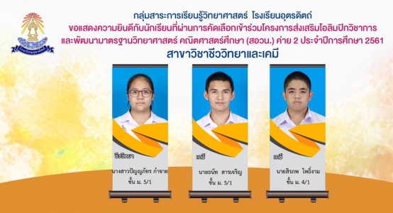 แสดงความยินดีกับนักเรียนที่ผ่านการคัดเลือกเข้าร่วมโครงการส่งเสริมโอลิมปิกวิชาการและพัฒนามาตรฐานวิทยาศาสตร์ คณิตศาสตรศึกษา (สอวน.) ค่าย 2 ประจำปีการศึกษา 2561 สาขาวิชาคณิตศาสตร์ สาขาวิชาวิทยาศาสตร์ สาขาวิชาชีววิทยา และ สาขาวิชาเคมี มหาวิทยาลัยนเรศวร ได้แก่ ✅ นายบวรทัต เกิดส่ง ชั้นมัธยมศึกษาปีที่ 4/1 ✅ นายสรเชษฐ์ มีปา ชั้นมัธยมศึกษาปีที่ 4/1 ✅ นายกันณวัฒน์ จันรุน ชั้นมัธยมศึกษาปีที่ 5/1 ✅ นายโชคชัย ชูพาณิชสกุล ชั้นมัธยมศึกษาปีที่ 5/1 ✅ นายสิรภพ โพธิ์งาม ชั้นมัธยมศึกษาปีที่ 4/1 ✅ นายธนัท สารเจริญ ชั้นมัธยมศึกษาปีที่ 5/1 ✅ นางสาวปัญญภัทร กำจาย ชั้นมัธยมศึกษาปีที่ 5/1