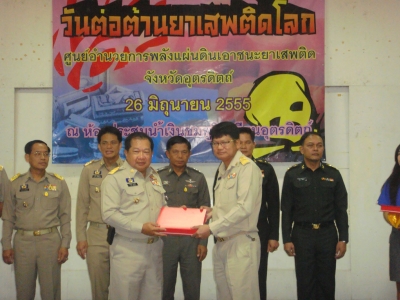 วันอังคารที่ 26 มิถุนายน 2555 นายจลัญ อินตายวง ผู้อำนวยการโรงเรียนบ้านโคนพิทยา เข้ารับโล่ประกาศเกียรติคุณ ผู้ที่มีผลงานดีเด่นด้านการสร้างภูมิคุ้มกันและป้องกันยาเสพติด ตามยุทธศาสตร์พลังแผ่นดินเพื่อเอาชนะยาเสพติด ประจำปี 2555 จังหวัดอุตรดิตถ์ จากนายโยธินศร์ สมุทรคีรีจ์ ผู้ว่าราชการจังหวัดอุตรดิตถ์ ในงานวันต่อต้านยาเสพติดโลก ที่จัดขึ้นณ หอประชุมน้ำเงินชมพูโรงเรียนอุตรดิตถ์(ปชส.บ้านโคนพิทยา ภาพ/ข่าว)