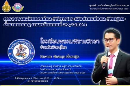 วันศุกร์ที่ 8 ตุลาคม 2564 คณะครูโรงเรียนพรหมพิรามวิทยา พร้อมคณะครูกว่า 10 โรงเรียนเข้าร่วมการอบรมหลักเกณฑ์และวิธีการประเมินตำแหน่งและวิทยฐานะข้าราชการครู และบุคลากรทางการศึกษา ตามหลักเกณฑ์ ว9/2564 ตามโครงการพัฒนาครูและบุคลากร ประจำปีการศึกษา 2564 โดยได้รับความอนุเคราะห์จากวิทยากร คุณครูจักรกฤช เลื่อนกฐิน ตำแหน่งครู วิทยฐานะครูชำนาญการพิเศษ จากโรงเรียนบางละมุง จังหวัดชลบุรี ซึ่งได้รับเกียรติจาก ดร.อุไร ปัญญาสิทธิ์ ผู้อำนวยการโรงเรียนพรหมพิรามวิทยา ที่ให้ความสนับสนุน ส่งเสริมการพัฒนาครูและบุคลากรอย่างเต็มที่ เป็นประธานในพิธีเปิดการอบรมผ่านระบบ Google Meet พร้อมคณะผู้บริหาร หัวหน้ากลุ่มสาระการเรียนรู้ร่วมพิธีเปิด ณ ห้องโสตทัศนศึกษา โรงเรียนพรหมพิรามวิทยา
