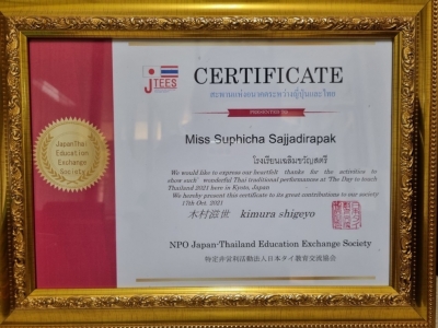 วันที่ 23 พฤศจิกายน 2564 ดร.สุรสิทธิ์ ลาภอินทรีย์ ผู้อำนวยการโรงเรียนเฉลิมขวัญสตรี มอบเกียรติบัตรชื่นชมและขอบคุณจากประเทศญี่ปุ่น ให้แก่ นางสาวสุพิชฌาย์ สัจจะดิระภักดิ์ นักเรียนโครงการพัฒนาทักษะภาษาญี่ปุ่น ชั้นมัธยมศึกษาปีที่ 4.11 โรงเรียนเฉลิมขวัญสตรี ในการนำเสนอคลิปวิดีโอแนะนำจังหวัดพิษณุโลก เพื่อเป็นการสานสัมพันธภาพสะพานแห่งอนาคตระหว่างญี่ปุ่นและไทย โดยสมาคมแลกเปลี่ยนการศึกษาไทย-ญี่ปุ่น : Japan-Thailand Education Exchange Society (JTEES) ไปยังสมาคมฯ ที่เมืองเกียวโต ประเทศญี่ปุ่น เมื่อวันที่ 21 ตุลาคม 2564 ที่ผ่านมา และได้รับคำชื่นชมมาจากทางสมาคมฯ เป็นอย่างมาก