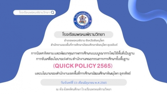 หัวข้อข่าว : การนิเทศ ติดตาม และพัฒนาคุณภาพการศึกษาแบบบูรณาการโดยใช้พื้นที่เป็นฐานการขับเคลื่อนนโยบายเร่งด่วน สพฐ. (QUICK POLICY 2565) และนโยบายของ สพม.พิษณุโลก อุตรดิตถ์