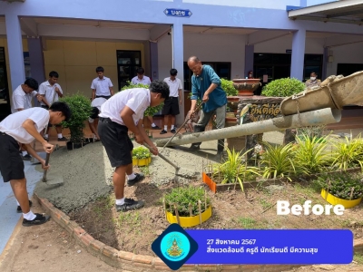 ดร.สุวัฒน์ สัตย์ซื่อ ผู้อำนวยการโรงเรียนดอนทองวิทยา มอบหมายให้ นายสุรชัย นาคน้อย หัวหน้ากลุ่มงานบริหารทั่วไป และนายสวัสดิ์ วงศ์สอน งานอาคารสถานที่ ดูแลการปรับปรุงภูมิทัศน์สวนหย่อมหน้าอาคารบงกช ตามนโยบายและจุดเน้น สิ่งแวดล้อมดี ครูดี นักเรียนดี มีความสุข โดยการเทปูนเพื่อแก้ไขปัญหาความสกปรกจากดินโคลนในฤดูฝน และความสะดวกในการบำรุงรักษา โดยได้รับความร่วมมือจากนักเรียน และนักการภารโรง ร่วมด้วยช่วยกันทำให้งานสำเร็จลุล่วงไปด้วยดี มีความสะอาด ปลอดภัย