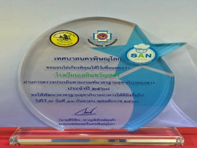 คณะผู้บริหาร คณะครู บุคลากรและนักเรียนโรงเรียนเฉลิมขวัญสตรี ขอแสดงความยินดีกับงานโภชนาการ โรงเรียนเฉลิมขวัญสตรี ที่ผ่านการตรวจประเมินสุขาภิบาลอาหารในโรงอาหาร ประจำปี 2568 ตามโครงการพัฒนายกระดับคุณภาพงานคุ้มครองผู้บริโภค จากเทศบาลนครพิษณุโลก โดยนางพิมลรัตน์ อ่ำอยู่ หัวหน้างานโภชนาการ และนางสาวนิตยา ทองทา กลุ่มบริหารงานทั่วไป เข้าร่วมพิธีรับโล่ เกียรติบัตร และป้ายรับรองมาตรฐานด้านสุขาภิบาลอาหารระดับพื้นฐาน (Sanitation Accountability Network : SAN) จากนายศิริชิน หาญพิทักษ์พงศ์ นายกเทศมนตรีนครพิษณุโลก เมื่อวันที่ 11 กันยายน 2568 ณ ห้องจุฬามณี สำนักงานเทศบาลนครพิษณุโลก