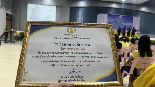 วันที่ 25 กันยายน 2568 นายชัยลักษณ์ รักษา ผู้อำนวยการโรงเรียนวังทองพิทยาคม พร้อมด้วยนายธนศักดิ์ ตะนะขิง ครูโรงเรียนวังทองพิทยาคม เข้าร่วมรับรางวัลชนะเลิศ โรงเรียนสะอาดและใช้ประโยชน์จากขยะ (ต้นแบบ) ประจำอำเภอวังทอง ตามแผนในการขับเคลื่อนการบริหารจัดการ (Road Map) จังหวัดพิษณุโลก โดยได้รับเกียรติจากนายทวี เสริมภักดีกุล ผู้ว่าราชการจังหวัดพิษณุโลก เป็นผู้มอบเกียรติบัตรในครั้งนี้ ณ ห้องประชุมนครหลวงสองแคว อาคารบึงราชนก ตำบลวังทอง อำเภอวังทอง จังหวัดพิษณุโลก