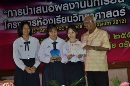 การแข่งขันโครงงานวิทยาศาสตร์ของกลุ่มโรงเรียนจุฬาภรณราชวิทยาลัย วันที่ 29 31 สิงหาคม 2555 ณ โรงเรียนจุฬาภรณราชวิทยาลัย ตรัง จังหวัดตรัง เรื่อง ศึกษาการผลิตเอทานอลจากผลเต่ารั้งและกลอย ได้รับรางวัล รองชนะเลิศอันดับ 2 สาขา เคมี คณะผู้จัดทำ นายโชติทัศ ศรีบุญ นายณัฐปพนธ์ เหล่าบุรินทร์ นายพงศ์ศิริ เรณุมาน ได้รับ โล่และเกียรติบัตร อาจารย์ที่ปรึกษา นางณัฐภัสสร เหล่าเนตร์...