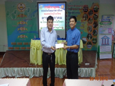 เมื่อวันที่ ๒๖ ตุลาคม ๒๕๕๕ เวลา ๑๓.๐๐ น. ผู้อำนวยการโรงเรียน รองผู้อำนวยการโรงเรียน และคณะครูโรงเรียนทุ่งกะโล่วิทยา ร่วมกันต้อนรับ คณะผู้บริหารและคณะครูโรงเรียนดาราพิทยาคม จังหวัดอุตรดิตถ์ จำนวน ๑๓ คน ที่มาศึกษาดูงานการจัดทำเอกสารในแต่ละมาตรฐานที่ใช้ในการเข้ารับการประเมินคุณภาพภายนอกรอบ ๓ ณ ห้องพลังคุณภาพ โรงเรียนทุ่งกะโล่วิทยา จังหวัดอุตรดิตถ์ ( ข่าว : ณัฐกานต์ / ภาพ : ชุลีพร )
