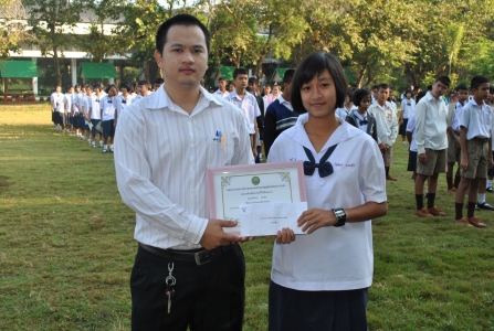 นายพยัพ อนันนิล ผู้อำนวยการโรงเรียนประชาสงเคราะห์วิทยา มอบรางวัลแก่นักเรียนที่ได้รับรางวัลรองชนะเลิศ อันดับ ๒ การประกวดร้องเพลงไทยลูกทุ่งช้า คือ นางสาวโชติรส นวนคำ นักเรียนชั้นมัธยมศึกษาปีที่ ๓/๑ เมื่อวันที่ ๑๔ ธันวาคม ๒๕๕๕ ณ ศูนย์ประสานแผนอำเภอบางระกำ อำเภอบางระกำ จังหวัดพิษณุโลก ทั้งนี้ เพื่อเป็นการเปิดโอกาสให้คณะครู และนักเรียนได้ร่วมแสดงความยินดีร่วมกัน หลังพิธีเข้าแถวเคารพธงชาติ เช้าวันนี้ (๑๘ ธันวาคม ๒๕๕๕) ความสำเร็จครั้งนี้ มีครูผู้ฝึกซ้อม คือ นายสุรพันธ์ ยารังกา ครู ค.ศ.๑ .............................(ฉัตรวนันท์ ขุนด่าน งานประชาสัมพันธ์โรงเรียนประชาสงเคราะห์วิทยา : ภาพ/ ข่าว)