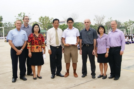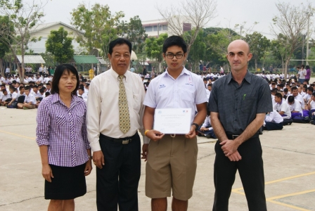 นายสัมฤทธิ์ ทองรัตน์ ผู้อำนวยการโรงเรียนพิษณุโลกพิทยาคม มอบเกียรติบัตรรางวัลชมเชยแก่ นายธนศักดิ์ แรงจบ ม.6.12 จากการแข่งขันบรรยายภาพเป็นภาษาฝรั่งเศส ระดับมัธยมศึกษา รางวัลพระราชทานจากสมเด็จพระเทพรัตน์ราชสุดาฯ สยามบรมราชกุมารี ณ สนามหน้าเสาธงโรเรียนพิษณุโลกพิทยาคม วันที่ 12 ธันวาคม 2555