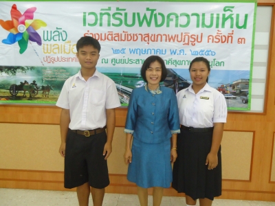 นางวิมลศรี สุมิตสวรรค์ คณะกรรมการสถานศึกษาขั้นพื้นฐาน นางสุนิศา ดิษฐ์แก้ว ครูชำนาญการ นางสาวชัญญานุช อ่วมแจง และนายสุทัศชา ราชณรินทร์ สภานักเรียนโรงเรียนเตรียมอุดมศึกษา ภาคเหนือ เข้าร่วมประชุมรับฟังความคิดเห็นต่อร่างมติสมัชชาปฏิรูปประเทศไทย ครั้งที่ ๓ เวทีจังหวัดพิษณุโลก ณ สำนักงานสาธารณสุขจังหวัดพิษณุโลก เมื่อวันที่ ๒๕ พฤษภาคม ๒๕๕๖//ผู้ส่งข่าว:อ้อยทิพย์ ฉิมบ้านไ่ร่ หัวหน้าฝ่ายบริหารทั่วไปโรงเรียนเตรียมอุดมศึกษา ภาคเหนือ