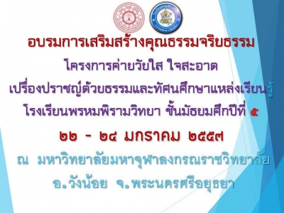 นักเรียนระดับชั้นมัธยมศึกษาปีที่ ๕ โรงเรียนพรหมพิรามวิทยาเข้าร่วมโครงการค่ายวัยใส ใจสะอาด เปรื่องปราชญ์ด้วยธรรมทัศนศึกษาเรียนรู้ ณ มหาวิทยาลัยมหาจุฬาลงกรณ์ราชวิทยาลัย อำเภอวังน้อย จังหวัดพระนครศรีอยุธยา ระหว่างวันที่ ๒๒ - ๒๔ มกราคม ๒๕๕๗