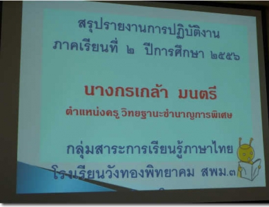 เมื่อวันที่ 20 มีนาคม 2557 คณะครูทุกกลุ่มสาระการเรียนรู้จัดแสดงผลงานการปฏิบัติงาน ในรอบ 6 เดือน ในรูปแบบการจัดนิทรรศการผลงาน และนำเสนอผลงานด้วย Power Point หรือ VTR แสดงผลงานเป็นรายบุคคล คนละไม่เกิน 5 นาที ณ ห้องโสตทัศนูปกรณ์