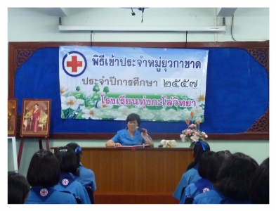 วันอังคารที่ ๘ กรกฎาคม ๒๕๕๗ โรงเรียนทุ่งกะโล่วิทยา จัดพิธีเข้าประจำกองหมู่ยุวกาชาด ณ ห้องประชุมภูมิพลัง โรงเรียนทุ่งกะโล่วิทยา โดยมีนางสาวกาญจนา ทองเดชศรี หัวหน้างานยุวกาชาดโรงเรียนทุ่งกะโล่วิทยา เป็นประธาน มอบเข็มแก่นักเรียนยุวกาชาดระดับชั้นมัธยมศึกษาปีที่ ๑ จำนวน ๒๓ คน ที่เข้าร่วมพิธีประจำหมู่ ยุวกาชาดในครั้งนี้ (ข่าว/ภาพ:ครูชุลีพร ปานธูป)