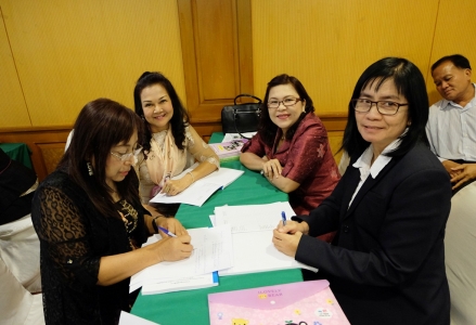 ดร.ผกามาศ บุญเผือก ผู้ช่วยผู้อำนวยการกลุ่มงานวิชาการโรงเรียนเฉลิมขวัญสตรี,นางสาวศุภนิดา ทองหยิบ หัวหน้างานแนะแนวโรงเรียนเฉลิมขวัญสตรี,นางกนกวรรณ มโนตั้งวรพันธ์ ศึกษานิเทศก์สำนักงานเขตพื้นที่การศึกษามัธยมศึกษา เขต 39 และนางโชติกา กุลจู นักวิชาการศึกษาสำนักงานเขตพื้นที่การศึกษามัธยมศึกษา เขต 39 นำเสนอผลการดำเนินงานศูนย์แนะแนวประจำสำนักงานเขตพื้นที่การศึกษามัธยมศึกษา เขต 39 ในการประชุมปฏิบัติการขับเคลื่อนการดำเนินงานศูนย์แนะแนวประจำสำนักงานเขตพื้นที่การศึกษามัธยมศึกษาเพื่อพัฒนาความเข้มแข็งด้านการแนะแนวอาชีพ ระหว่างวันที่ 27-29 กรกฎาคม 2557 ณ โรงแรมแกรนด์ ทาวเวอร์ อินน์ กรุงเทพฯ (ภาพ:ผกามาศ/ข่าว:ประชาสัมพันธ์)