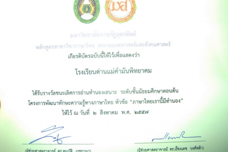 นางสาวประทุม ใสสีสูบ ตำแหน่งครูชำนาญการพิเศษ โรงเรียนด่านแม่คำมันพิทยาคม ผู้ฝึกสอนและควบคุมนักเรียนเข้าร่วมแข่งขันโครงการพัฒนาทักษะความรู้ทางภาษาไทย หัวข้อ "ภาษาไทยเรานี้มีทำนอง" เมื่อวันที่ 2 สิงหาคม 2557 ณ มหาวิทยาลัยราชภัฎอุตรดิตถ์ ผลการแข่งขันมีดังนี้ นางสาวกรพินธุ์ บัวศรี นักเรียนชั้นมัธยมศึกษาปีที่ 3/1 ได้รับรางวัลชนะเลิศ การอ่านทำนองเสนาะ ระดับชั้นมัธยมศึกษาตอนต้น ได้รับเงินรางวัล 2,000 บาท ทำให้โรงเรียนด่านแม่คำมันพิทยาคม ได้รับเกียรติบัตรรางวัลชนะเลิศ การอ่านทำนองเสนาะ นางสาวทิพย์ลัดดา มาคุ้ม นักเรียนชั้นมัธยมศึกษาปีที่ 6 เข้าร่วมการอ่านประกวดทำนองเสนาะ ระดับชั้นมัธยมศึกษาตอนปลาย