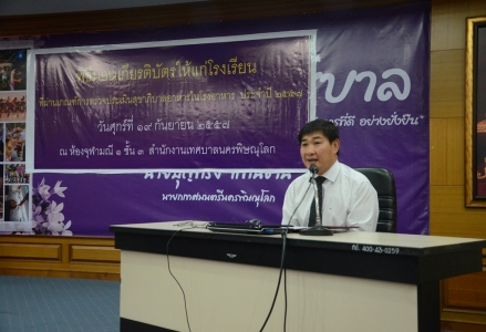 วันที่่่ 19 กันยายน 2557 ครูศิริรัตน์ จีนใจตรง ครูกลุ่มสาระการเรียนรู้การงานอาชีพและเทคโนโลยี ผู้รับผิดชอบงานโภชนาการโรงเรียน รับมอบเกียรติบัตรโรงเรียนที่ผ่านการตรวจประเมินสุขาภิบาลอาหารในโรงอาหาร ประจำปี 2557 ตามเกณฑ์มาตรฐานการสุขาภิบาลอาหาร ได้มาตรฐานระดีมาก จากนายบุญทรง แทนธานี นากยกเทศมนตรีเทศบาลนครพิษณุโลก ณ ห้องจุฬามณี 1 ชั้น 3 สำนักงานเทศบาลนครพิษณุโลก (ภาพ:ศิริรัตน์/ข่าว:ประชาสัมพันธ์)