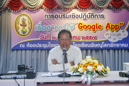นายสัมฤทธิ์ ทองรัตน์ ผู้อำนวยการโรงเรียนพิษณุโลกพิทยาคม เป็นประธานเปิดการอบรมเชิงปฏิบัติการ การใช้โปรแกรม Google app ในการจัดการเรียนการสอน ณ ห้องประชุมไชยานุภาพ โรงเรียนพิษณุโลกพิทยาคม ระหว่างวันที่ 2 3 ตุลาคม 2557