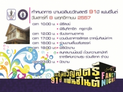 สมาคมศิษย์เก่าเฉลิมขวัญสตรีและโรงเรียนเฉลิมขวัญสตรี ขอเชิญศิษย์เก่า แขกผู้มีเกียรติร่วมงาน"เฉลิมขวัญสตรี 91 ปีแฟนซีไนต์" วันเสาร์ที่่ 8 พฤศจิกายน 2557 พบปะสังสรรค์ สนุกสนานกับวงดนตรี ร่วมลีลาศรำวง ณ สนามโรงเรียนเฉลิมขวัญสตรี (ภาพ/ข่าว:ประชาสัมพันธ์)