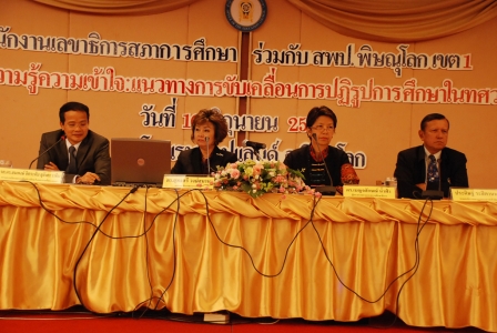 เมื่อวันที่ 16 มิ.ย. 54 นายสุชน วิเชียรสรรค์ รองผู้อำนวยการสำนักงานเขตพื้นที่การศึกษามัธยมศึกษา เขต 39 และคณะผู้บริหารในสังกัด บุคลากรทางการศึกษาฯ พร้อมกับผู้บริหารด้านการศึกษา 5 องค์กรหลัก จากจังหวัดภาคเหนือตอนล่าง เข้าร่วมประชุม สร้างความรู้ความเข้าใจ แนวทางการขับเคลื่อนการปฏิรูปการศึกษาในทศวรรษที่สอง ซึ่งจัดโดย สำนักงานเลขาธิการสภาการศึกษา (สกศ.) ร่วมกับ สพป.พิษณุโลก เขต 1 ได้รับเกียรติจาก ดร.ปรีชา เรืองจันทร์ ผู้ว่าราชการจังหวัดพิษณุโลก เป็นประธาน ณ โรงแรมท๊อปแลนด์ จังหวัดพิษณุโลก ..ผู้ว่าฯ แนะครูต้องสอนวิชากินให้พอกับวิชาการ โดยวิชากินนั้น หมายถึง การเรียนการสอนที่ทำให้เด็กสามารถในการทำอาชีพเลี้ยงตัวได้ การปฏิรูปการศึกษาจะสำเร็จต้องปฏิรูปสิ่งต่างๆ ประกอบด้วย 1. ครูและแหล่งผลิตครู ต้องเน้นเรื่องจิตวิญญาณความเป็นครู และที่สำคัญครูต้องสอนทั้งวิชาการและวิชาชีวิต ปัจจุบันช่องว่างครูกับนักเรียนมากขึ้น เพราะครูอยู่ในเมืองไม่ได้อยู่ในพื้นที่กับเด็กเหมือนเมื่อก่อน 2. สิ่งแวดล้อม บรรยากาศและค่าตอบแทน เงินเดือนครูต้องสูง ให้ครูอยู่อย่างสง่างาม งบประมาณต้องทุ่มเทให้นักเรียน ไม่ใช่ทำเพื่อบริการครู 3. ผู้ปกครอง ต้องเอาใจลูก เพราะเวลา 2 ใน 3 ของเด็กอยู่กับผู้ปกครอง โรงเรียนต้องทำความเข้าใจกับผู้ปกครองเรื่องการดูแดลูกด้วย 4. ปรับระบบการประเมินใหม่ อย่าเอาแต่ประเมินเอกสารและอย่าประเมินให้มากเกินจนเสียบรรยากาศในการเรียน เพราะครูไม่มีเวลาสอนมัวแต่ไปทำเอกสาร ต้องปรับค่านิยมเรื่องการกวดวิชาที่มากเกินไป และฝากว่าการสอนต้องสอนให้จำ ทำให้ดู และอยู่ให้เป็น การสอนเด็กต้องสอนให้เด็กเรียนรู้ทั้งด้านวิชาการและวิชากิน คือ สามารถนำไปประกอบอาชีพได้ ...ดร.สุทธศรี วงษ์สมาน รองเลขาธิการสภาการศึกษา ผู้ดำเนินการประชุม และวิทยากรทั้ง 3 ท่าน ประกอบด้วย รศ.ดร.สมพงษ์ จิตระดับ สุอังคะวาทิน กรรมการนโยบายปฏิรูปการศึกษา (กนป.) , เบญจลักษณ์ น้ำฟ้า ผู้ตรวจราชการกระทรวงศึกษาธิการ , นายประดิษฐ์ ระสิตานนท์ รองเลขาธิการคณะกรรมการอาชีวศึกษา กล่าวว่า ข้อเสนอการปฏิรูปการศึกษาในทศวรรษที่สอง ประกอบด้วยประเด็นหลัก 3 ประการ 1. พัฒนาคุณภาพและมาตรฐานการศึกษาและเรียนรู้ 2. เพิ่มโอกาสทางการศึกษาและเรียนรู้ 3. ส่งเสริมการมีส่วนร่วมของทุกภาคส่วนของสังคมในการบริหารและจัดการศึกษา และได้กำหนดประเด็นสำคัญเร่งด่วน 4 ประการ คือ พัฒนาคุณภาพ คนไทยยุคใหม่ ครูยุคใหม่ สถานศึกษาและแหล่งเรียนรู้ยุคใหม่ การบริหารจัดการใหม่ /สกศ. : ข้อมูล , พิริยะด
