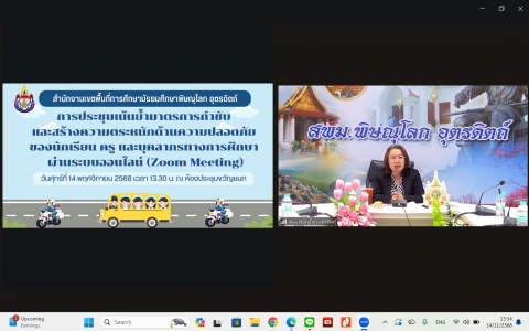 วันศุกร์ที่ 14 พฤศจิกายน 2568 เวลา 13.30 น. ดร.ศิริวรรณ ขวัญมุข ผู้อำนวยการสำนักงานเขตพื้นที่การศึกษามัธยมศึกษาพิษณุโลก อุตรดิตถ์ มอบหมายให้ ดร.จิรวรรณ สุรเสียง รองผู้อำนวยการสำนักงานเขตพื้นที่การศึกษามัธยมศึกษาพิษณุโลก อุตรดิตถ์ เป็นประธานการประชุมเน้นย้ำมาตรการกำชับ และสร้างความตระหนักด้านความปลอดภัยของนักเรียน ครู และบุคลากรทางการศึกษา และแนวทางการปฏิบัติในการพานักเรียนไปนอกสถานศึกษา ในรูปแบบออนไลน์ผ่านระบบ Zoom Meeting เพื่อให้สถานศึกษาในสังกัดปฏิบัติตามแนวทาง มาตรการอย่างเคร่งครัด ณ ห้องประชุมขวัญชนก สำนักงานเขตพื้นที่การศึกษามัธยมศึกษาพิษณุโลก อุตรดิตถ์