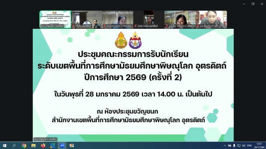 วันพุธที่ 28 มกราคม 2569 เวลา 14.00 น. ดร.ศิริวรรณ ขวัญมุข ผู้อำนวยการสำนักงานเขตพื้นที่การศึกษามัธยมศึกษาพิษณุโลก อุตรดิตถ์ มอบหมายให้ ดร.จิรวรรณ สุรเสียง รองผู้อำนวยการสำนักงานเขตพื้นที่การศึกษามัธยมศึกษาพิษณุโลก อุตรดิตถ์ เป็นประธานการประชุมคณะกรรมการรับนักเรียนระดับเขตพื้นที่การศึกษามัธยมศึกษาพิษณุโลก อุตรดิตถ์ ปีการศึกษา 2569 (ครั้งที่ 2) เพื่อพิจารณาให้ความเห็นชอบแผนการรับนักเรียน สัดส่วนการรับนักเรียน วิธีการคัดเลือกนักเรียน และจำนวนนักเรียนต่อห้อง และพิจารณาให้ความเห็นชอบการรับนักเรียนเงื่อนไขพิเศษ อีกทั้งพิจารณาอนุมัติการเก็บเงินบำรุงการศึกษา ปีการศึกษา 2569 โดยมีคณะกรรมการรับนักเรียนระดับเขตพื้นที่การศึกษามัธยมศึกษาพิษณุโลก อุตรดิตถ์ (จังหวัดพิษณุโลก) และคณะกรรมการรับนักเรียนระดับเขตพื้นที่การศึกษามัธยมศึกษาพิษณุโลก อุตรดิตถ์ (จังหวัดอุตรดิตถ์) ณ ห้องประชุมขวัญชนก สำนักงานเขตพื้นที่การศึกษามัธยมศึกษาพิษณุโลก อุตรดิตถ์ และในรูปแบบออนไลน์ผ่านระบบ Zoom meeting