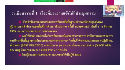 วันจันทร์ที่ 23 กุมภาพันธ์ 2569 เวลา 13.00 น. ดร.ศิริวรรณ ขวัญมุข ผู้อำนวยการสำนักงานเขตพื้นที่การศึกษามัธยมศึกษาพิษณุโลก อุตรดิตถ์ ในนามผู้อำนวยการเขตตรวจราชการ สำนักงานคณะกรรมการการศึกษาขั้นพื้นฐาน เขตตรวจราชการที่ 17 เป็นประธานการประชุมหารือการนำเสนอแนวทางการปฏิบัติงานที่เป็นเลิศ (Best Practice) ตามนโยบายจุดเน้นและนโยบายระยะเร่งด่วน (Quick Win) ของสำนักงานคณะกรรมการการศึกษาขั้นพื้นฐาน ปีงบประมาณ พ.ศ. 2569 เพื่อหารือการนำเสนอแนวทาง การปฏิบัติงานที่เป็นเลิศ (Best Practice) ตามนโยบายจุดเน้นและนโยบายระยะเร่งด่วน (Quick Win) ของเขตตรวจราชการที่ 17 ในรูปแบบออนไลน์ผ่านระบบ Zoom Meeting ณ ห้องประชุม PLC Center สำนักงานเขตพื้นที่การศึกษามัธยมศึกษาพิษณุโลก อุตรดิตถ์