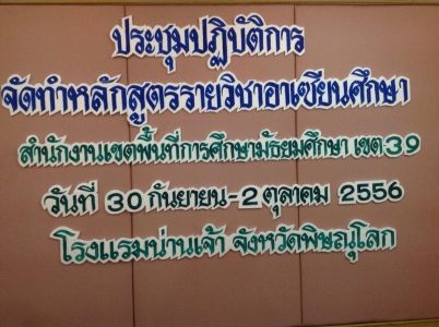 ดร.สมเกียรติ บุญรอด ผอ.สพม.39 ประธานเปิดการประชุมเชิงปฏิบัติการการจัดทำหลักสูตรรายวิชาอาเซียนศึกษา โดยมีคณะศึกษานิเทศก์ สพม.39 ร่วมจัดทำ ณ โรงแรมน่านเจ้า อ.เมืองพิษณุโลก